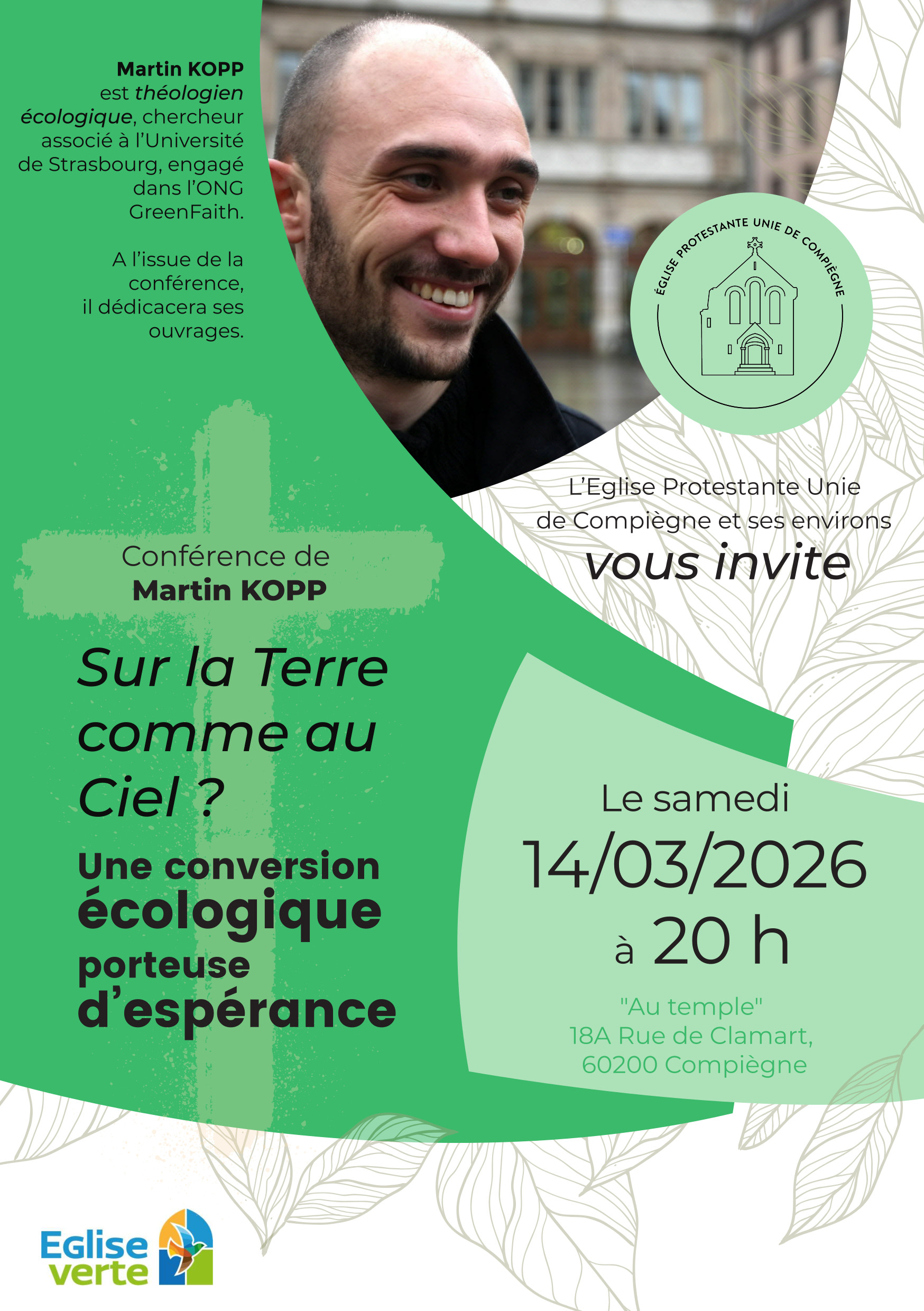 L'Eglise protestante unie de Compiègne et environs organise une conférence avec le théologien écologique Martin Kopp "Sur la terre comme au ciel, une conversion écologique porteuse d'éspérance" qui se tiendra le samedi 14 mars à 20h au temple de Compiègne, 18A rue de Clamart.